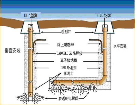 离子接地棒系统效果相当明显,它包括有高导电性回填材料,观察井,和永久性可靠的放热焊接,可以进行垂直安装和水平安装。